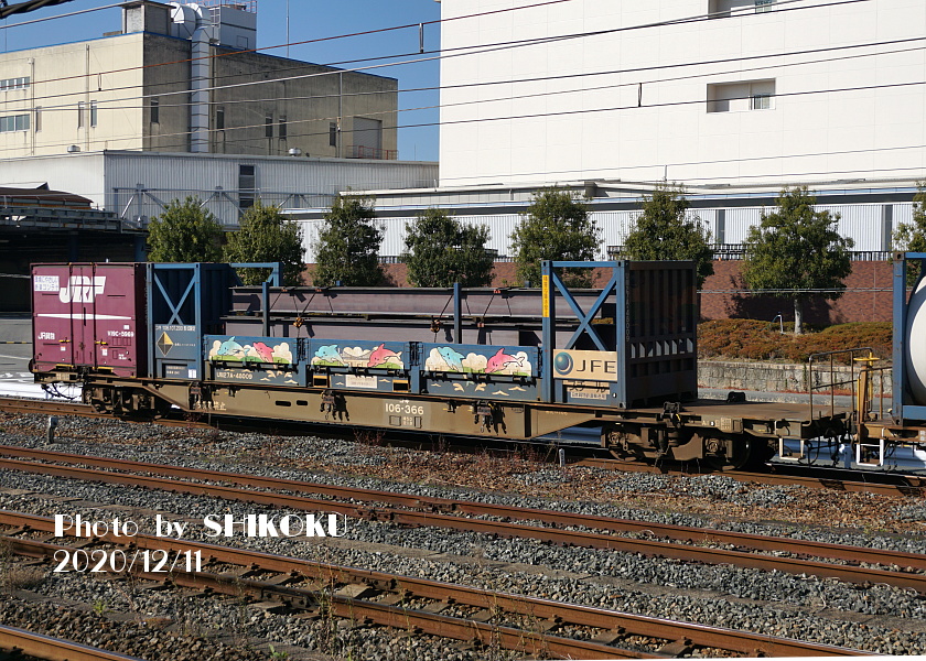 <20フィート×3> 幹線筋ではよく見られる、20フィートコンテナ3個積載パターン。 もっとも、タンクコンテナばかり3個積載というパターンはそうあるものではなく、ちょっと珍しいかも? 特に新居浜発着の3070/3071列車では、タンクコンテナばかり3個というパターンは割と頻繁にみられる。 |
