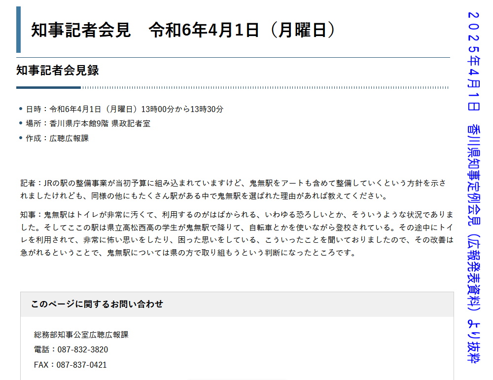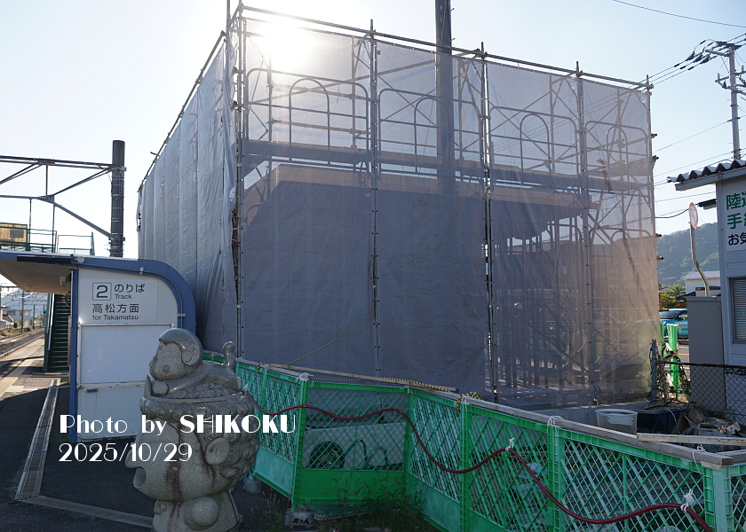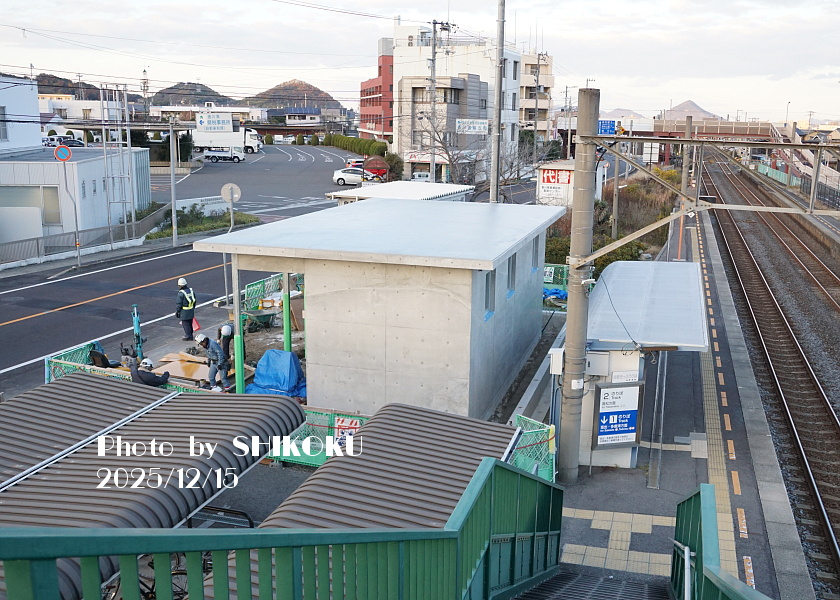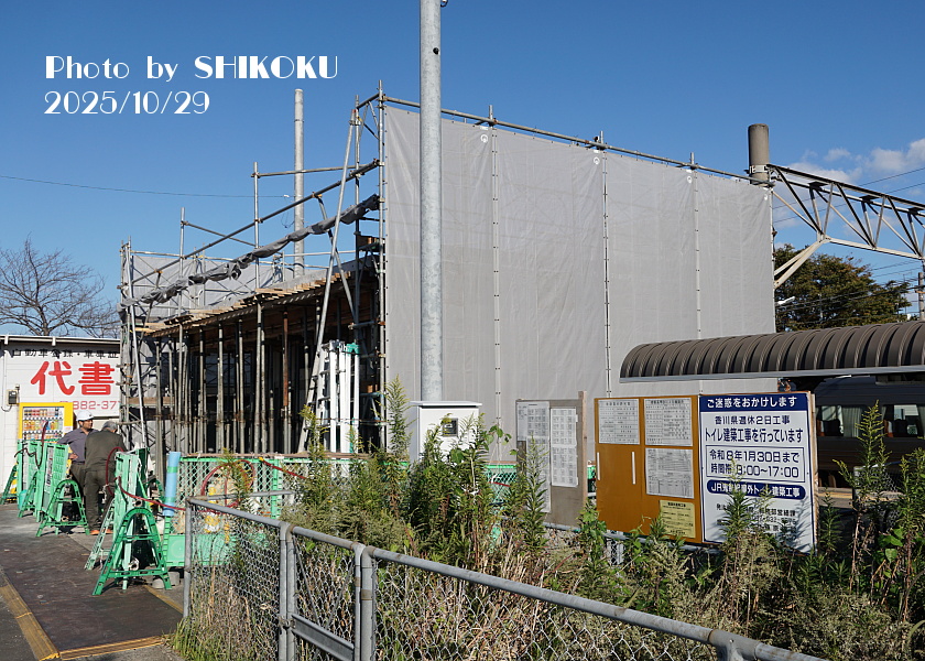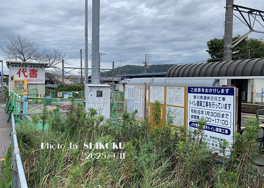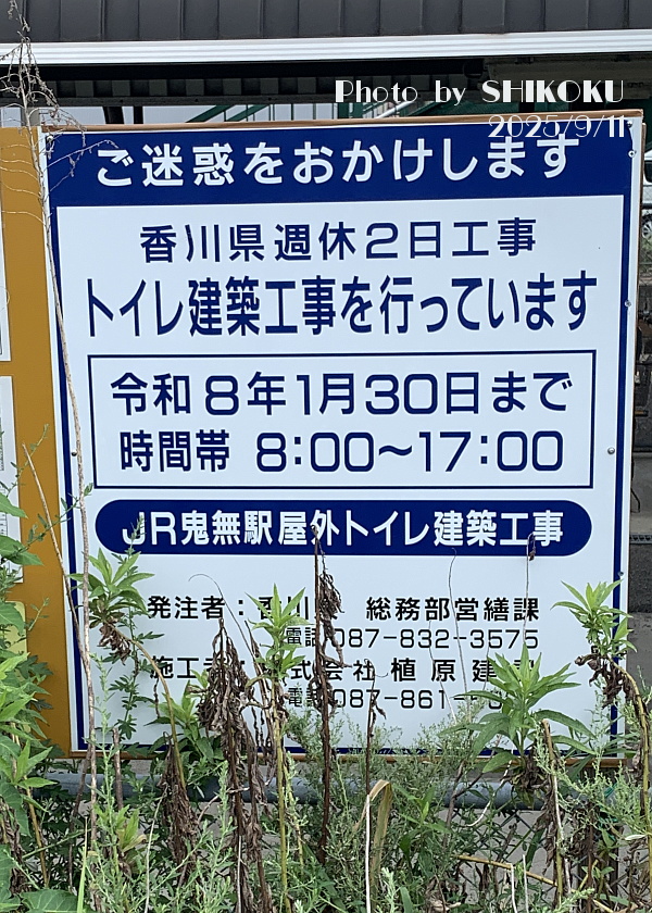 2025年度に入って、鬼無駅の北側(陸運事務局側)に柵ができて何かの工事が始まったという情報が得られた。 調べたところ鬼無駅のトイレ新設工事で、2025年度の香川県の予算として計上し実施しているものらしい。 ![]() 2025年4月1日 香川県知事定例会見(広報発表資料)より抜粋 従来の鬼無駅のトイレは、駅舎正面向かって右手にあるいわゆるボットン式の和式トイレであるが、「利用するのが”恐い"」のはいったい何が・・・? などと想像をかき立てられる(苦笑) ともあれ夏頃から工事が始まっていた模様で、2025年度内には完成の予定。 下に行くほど古い記事となっている。 |