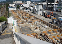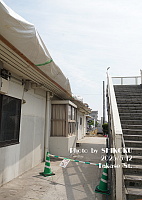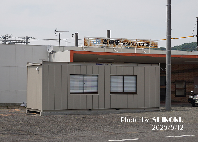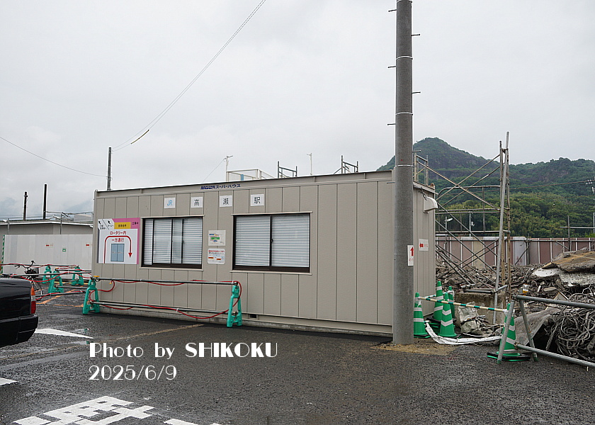 仮駅舎として使用するプレハブが設置され、旧駅舎の庇の部分が既に撤去されていた。