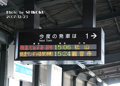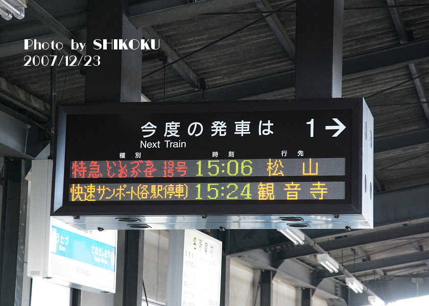 (2枚とも) 予讃線 鴨川〜八十場間 2002年3月23日 ![]() 予讃線 八十場〜坂出間 2002年4月20日 運転開始から間もない頃のキハ65+58の「サンポート」 ![]() 予讃線 多度津駅 2002年4月21日 121系の2両編成 121系 ![]() 予讃線 坂出〜宇多津間 2003年8月13日 2003年10月1日改正で、夜の上り1本(113系)が各駅停車に「格下げ」され、下り20本/上り21本となった。 使用車種は、113系下り3本/上り4本、6000系下り2本、7000系下り3本/上り1本、キハ65・キハ58系上り1本、これ以外は全て121系。 但し、使用車種は臨時に変更されることがあり、6000系は7000系が、113系は121系が代走する場合がある。 なお、7000系は下り1本が松山運転所所属車の運用で、その他は高松運転所所属車となる。 2005年3月1日改正では、新幹線の大幅な時刻改正に伴う「マリンライナー」のダイヤ変更があったことから、高松発着時刻基準で見ると、「マリンライナー」「サンポート」あわせてほぼ15分ごとのパターンダイヤとなり、従来に比べて改善が進んだ。 特に下り高松発は、9:58から17:13までの間、両列車合わせてきっちり15分ごとのダイヤとなっている。 また、従来上り1本だけ存在していた、鴨川で「マリンライナー」を待避する情けない列車も、この改正でめでたく消えている。 2008年3月15日改正では、新幹線の大幅な変更に伴う「マリンライナー」等の時刻変更を受け、高松〜坂出間での「マリンライナー」との15分間隔のパターンが崩れた。また、従来上り1本のみ設定されていた気動車列車が電車化され、これで全ての列車が電車による運転となったほか、従来1往復のみの設定だった6000系による運用が大幅に増えている。 スピード面では若干の改善が見られ、特に高松〜観音寺間は最速列車の所要時間がちょうど1時間(129M:6000系)と、あと一歩で1時間を切るところまで来たほか、琴平方面についても多度津などでの停車時間圧縮等により、全体的に所要時間が短縮されている。 また、宇多津・多度津で「南風」に接続する列車については、時刻表上は「サンポート南風リレー」と表記が改められたが、列車に掲出されるヘッドマークについては、どちらも「サンポート」のみとなっている。 この場合、従来は宇多津または多度津で「南風」を待つパターンが基本だったが、今改正では全てそのまま逃げ切る(下りの場合)か後を追う(上りの場合)パターンに変更され、「サンポート」としてのトータルでの所要時間短縮に寄与している。 6000系