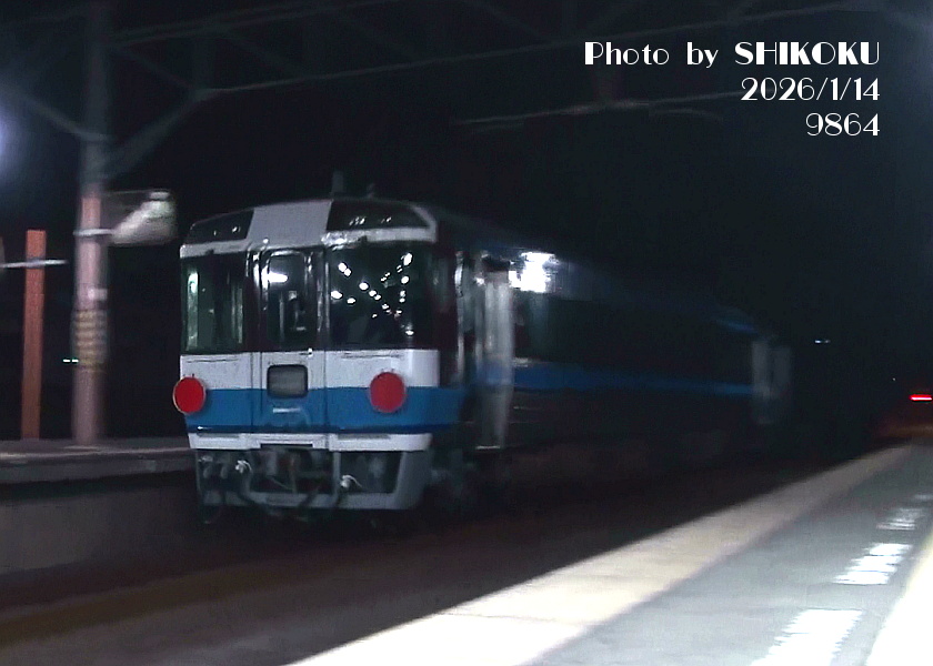 (2枚とも) 予讃線 鴨川駅 2026年1月14日 EF210形の牽引で九州へ向けて運ばれる、キハ185形の1016号車と1017号車。 このあとは、一旦神戸まで出て折り返して、西小倉まで甲種輸送された。 鴨川駅通過シーンの動画は こちら(Youtube:新規タブで開きます) | ||||