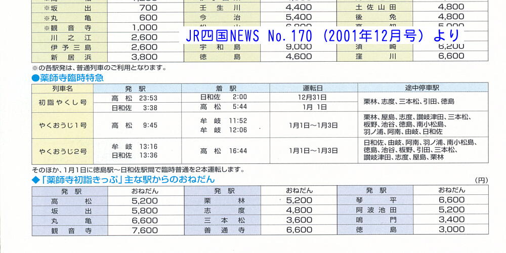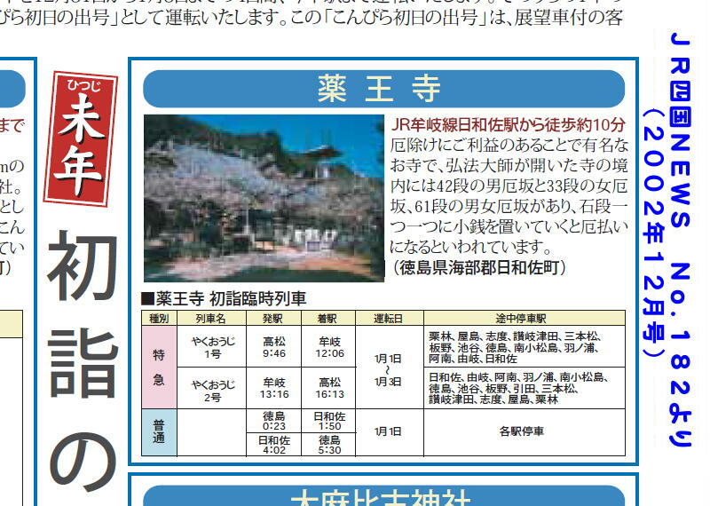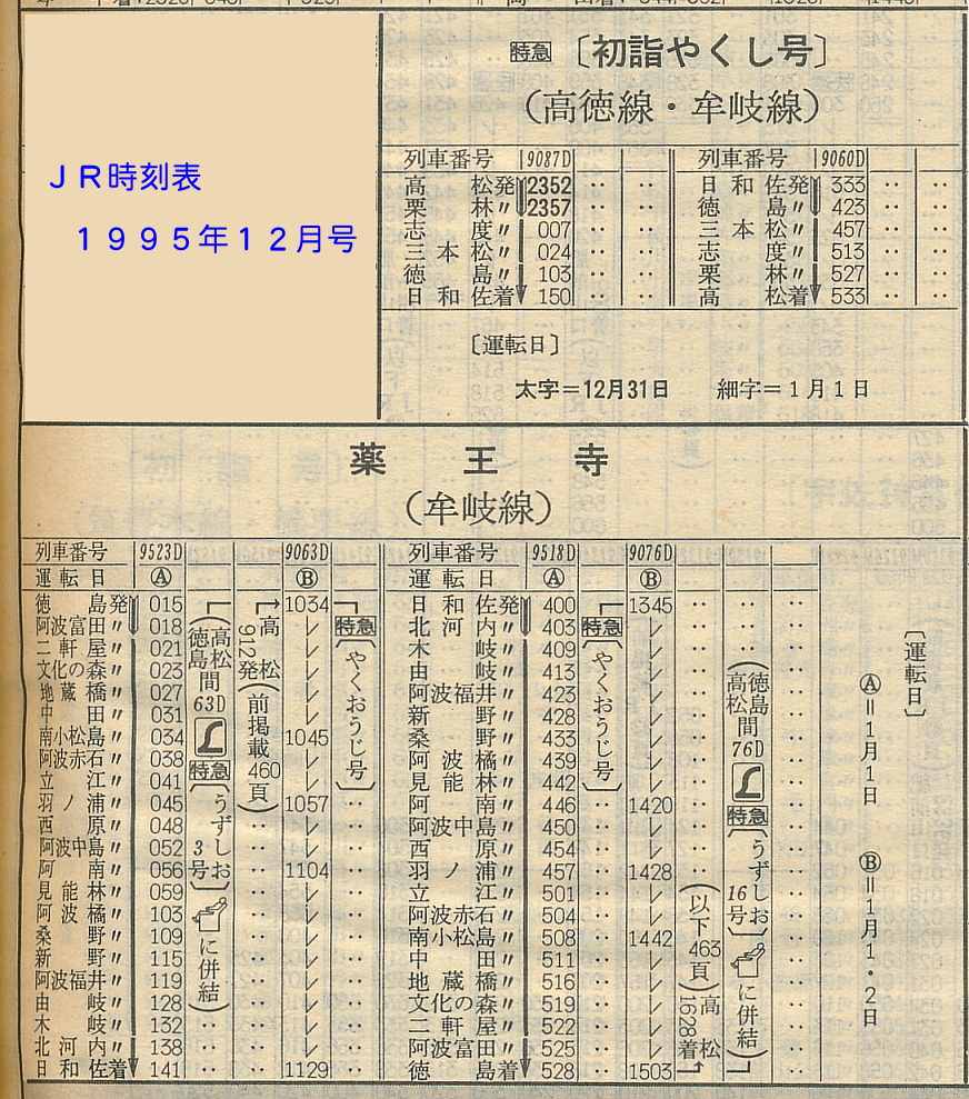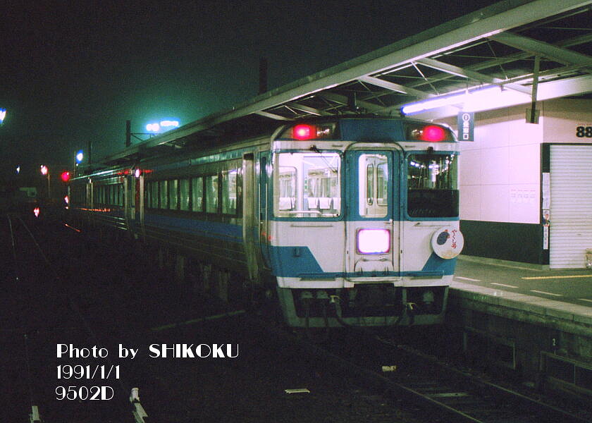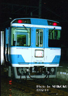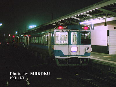 ![]() 予讃線 高松駅 1991年1月1日 長らくキハ185系充当の定番臨時列車であった、薬王寺への初詣臨時特急「やくし」号。 キハ58系使用の急行列車時代は円形ヘッドマークを掲げていたが、キハ185系で特急化された後もごく短期間だけ掲出されていた。 |