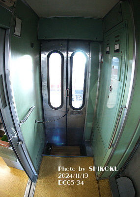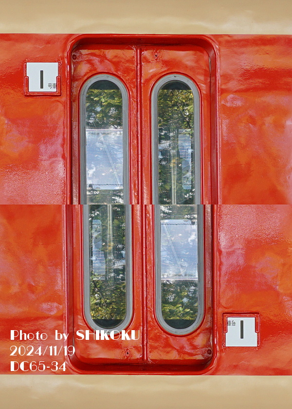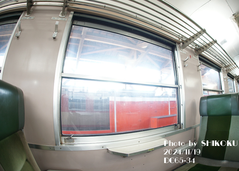 ![]() 四国鉄道文化館 2024年11月19日 なお、本来ユニット窓は上段側を下すことができるが、四国のキハ65形は2000年頃に上段側のつまみを撤去して、上半分を固定窓化している。 現在伊予西条で保存中の34号車も上段側のつまみが無い。 |