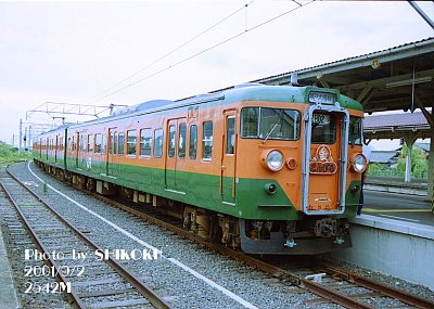 2545M![]() 土讃線 琴平駅 2003年7月6日 阪和線快速色車が瀬戸大橋線運用に入っていた時期もあった。 なお、よく見ると中間のモハ2両は湘南色となっている。 |