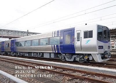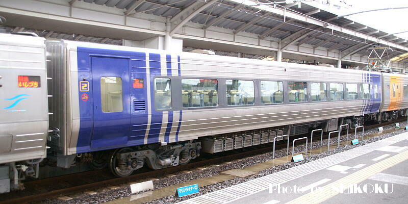 「しおかぜ」編成4号車の8300形。 多目的室(旧喫煙室)の有無以外は、「いしづち」編成7号車の8300形と同一仕様である。 基本的に自由席車となるが、多客時に「しおかぜ」が8両運転となるときは、指定席車となるのでご注意。 |