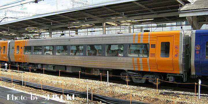 8400形のリニューアル車。 「しおかぜ」編成5号車の自由席車。 4号車同様、外観の塗り分けが変わっただけで内装は従来通りである。 リニューアル当初、この車両は編成中で唯一の「喫煙車両」であり、また編成中で唯一、車椅子対応設備のある車両でもあるのだが、2004年12月号の時刻表で全国のJR特急については、車椅子対応車を喫煙自由席車にしているのは、四国以外では皆無であった。 なお2008年3月改正で、四国内の特急は全車禁煙車となり、この問題については解消している。 後位側のドアが、車椅子乗降のために他より若干広くなっている。 ※他のドア:1,025mm(開口部810mm) ※8400形後位側ドア:1,110mm(開口部900mm) |