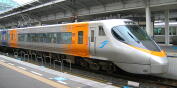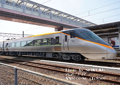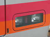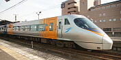 下り方先頭の8000形。 下り方半室が指定席グリーン室、上り方半分が普通車指定席車。 グリーン車のイメージカラーは赤で、8500形とはまた違ったイメージになっている。 なお、8506形ではリニューアルに際して運転助手席側のワイパーが復活していたが、8000形についてはワイパーの復活した車両は存在しない。 |