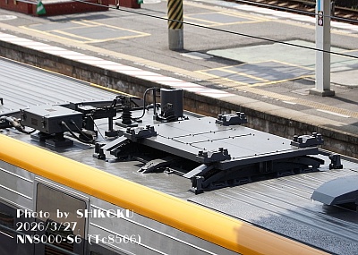 ベンチレータ3基と集電装置一式に加えて、列車無線アンテナと信号煙管を搭載。 |