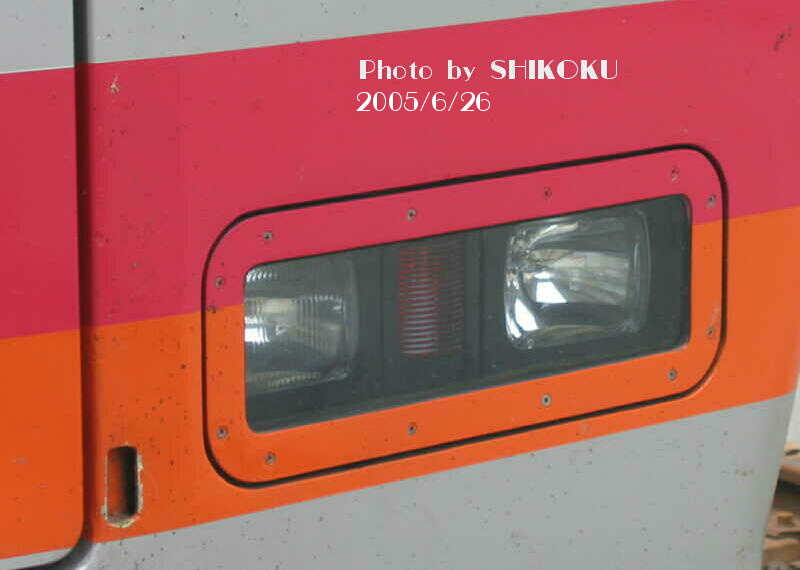 ベンチレータ3基と集電装置一式に加えて、列車無線アンテナと信号煙管を搭載。 基本的に8500形と同じだが、列車無線アンテナのすぐ後ろに、公衆電話用とおぼしき小型アンテナが搭載されているのが相違点。 またベンチレータの数が2基と、他形式に比べて1基少ないのが大きな特徴である。 左画像下側のリニューアル車はL5編成の8005形だが、この車両は2005年7月18日に「しおかぜ24号」として運転中に、予讃線・菊間付近で倒木に接触した車両で、ヘッドライトケース右側が凹んでいるのが見て取れる。 撮影したのは事故から2ヶ月後の9月21日だが、どうやら通常運転に支障がないため、次回の全般検査の時まで板金はお預けになっている模様である。 |