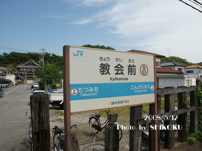 1924年に阿波電気軌道の停留所として開業。 1933年に国有化され、停車場となった。 駅名の由来となった「教会」は天理教の教会施設で、駅の真正面100mほどのところにある。 駅前の道路には、鳴門線と並行して走る鳴門市営バスが運行されているが、便数はバスの方が少ない。 ※鳴門市営バス 2010年度にバリアフリー対応工事が実施され、ホームの嵩上げが行われた。 |
