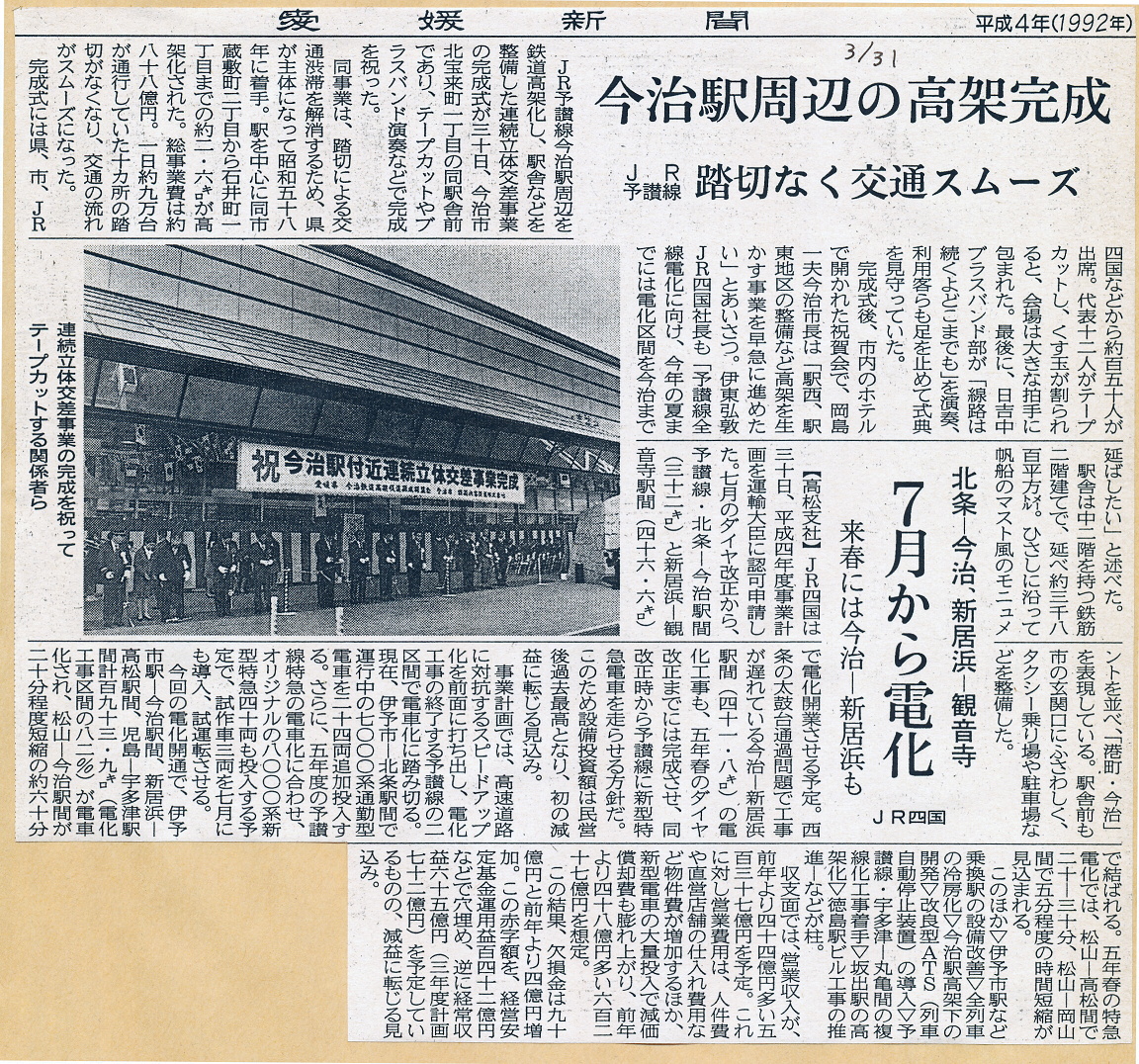 愛媛県第二の都市、今治市の中心駅。 予讃線・多度津〜松山間の駅では新居浜と並ぶ最重要駅と言って良く、市の中心部に近いことから利用者も多く、愛媛県内のJR駅では松山駅に次ぐ乗降客数を記録している。 開業時から現在に至るまで、当駅を通過する定期旅客列車は存在しない。なお、現在この区間に1往復だけが設定されている貨物列車も、当駅で停車している。 現在の総ガラス張りの駅舎は、1992年3月の高架化の際に竣工したもので、同月30日に記念式典が行われた 。かつては貨物扱い駅としても重要であったが、1984年に廃止されている。 駅前のバスターミナルからは、今治周辺のほか対岸の尾道・福山・広島方面行きも含めて、各方面へのバスが発着している。 ※瀬戸内運輸(せとうちバス) |