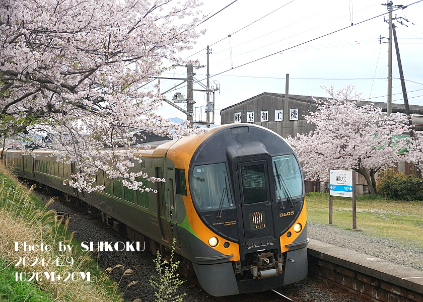 ![]() いしづち20号(手前2両:後部5両は「しおかぜ20号」 予讃線 津島ノ宮駅 2024年4月9日 台風の接近に伴う事前運休措置により瀬戸大橋線が不通となったことから、8両フル編成で予讃線を行く「いしづち」